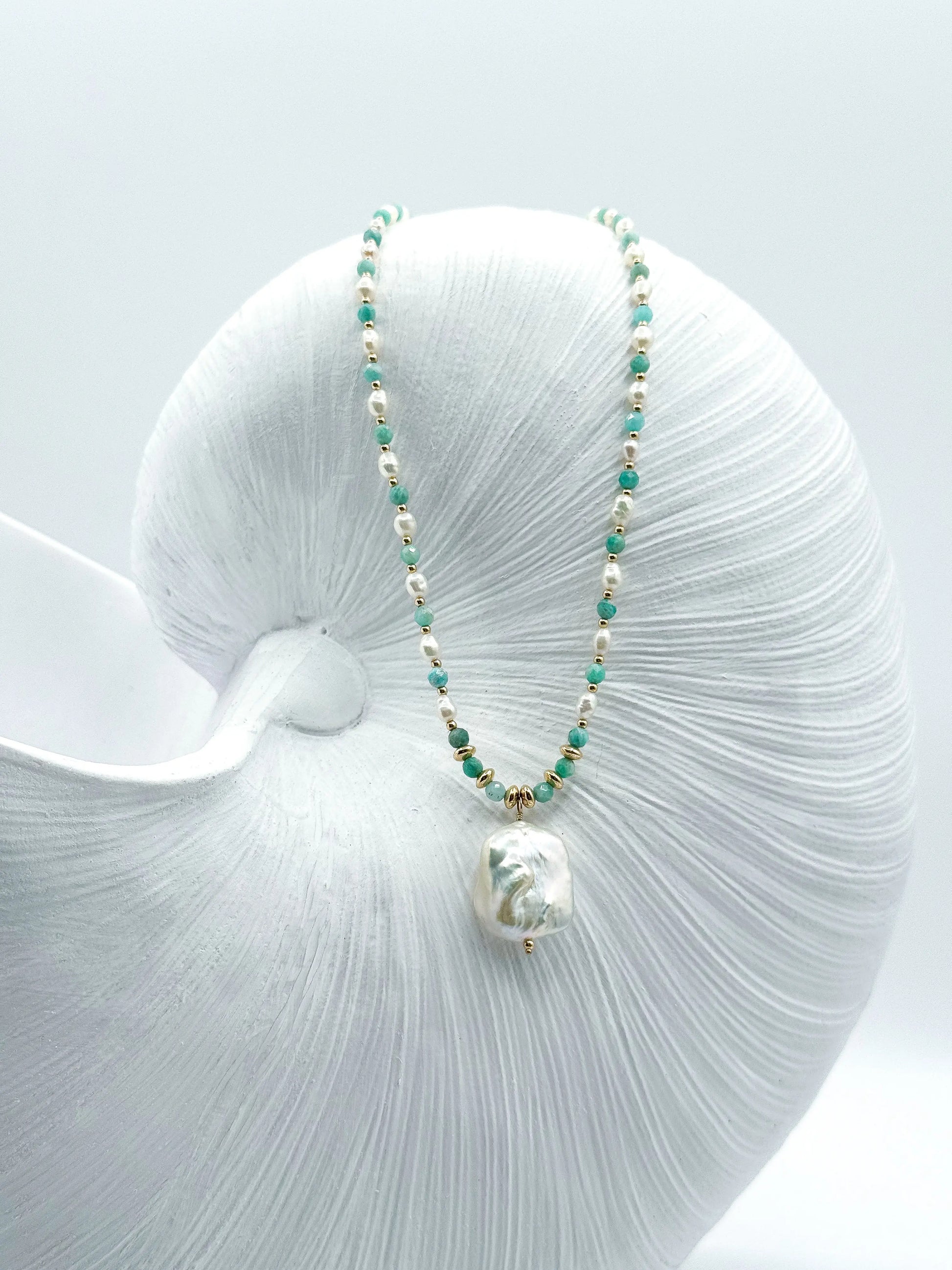 Hand-strung with Amazonite gemstones, White fresh water pearls, a single Baroque Pearl and 14K Gold Fill spacer beads